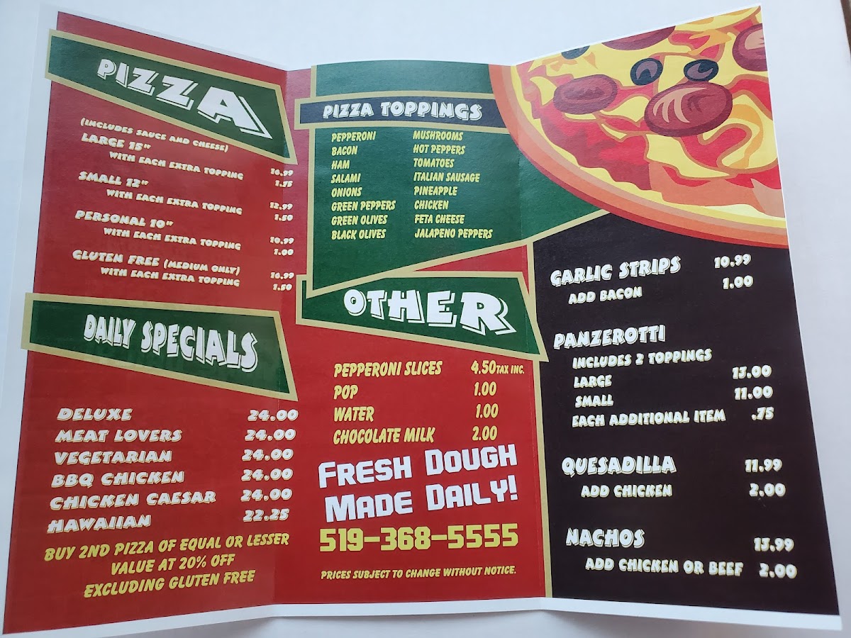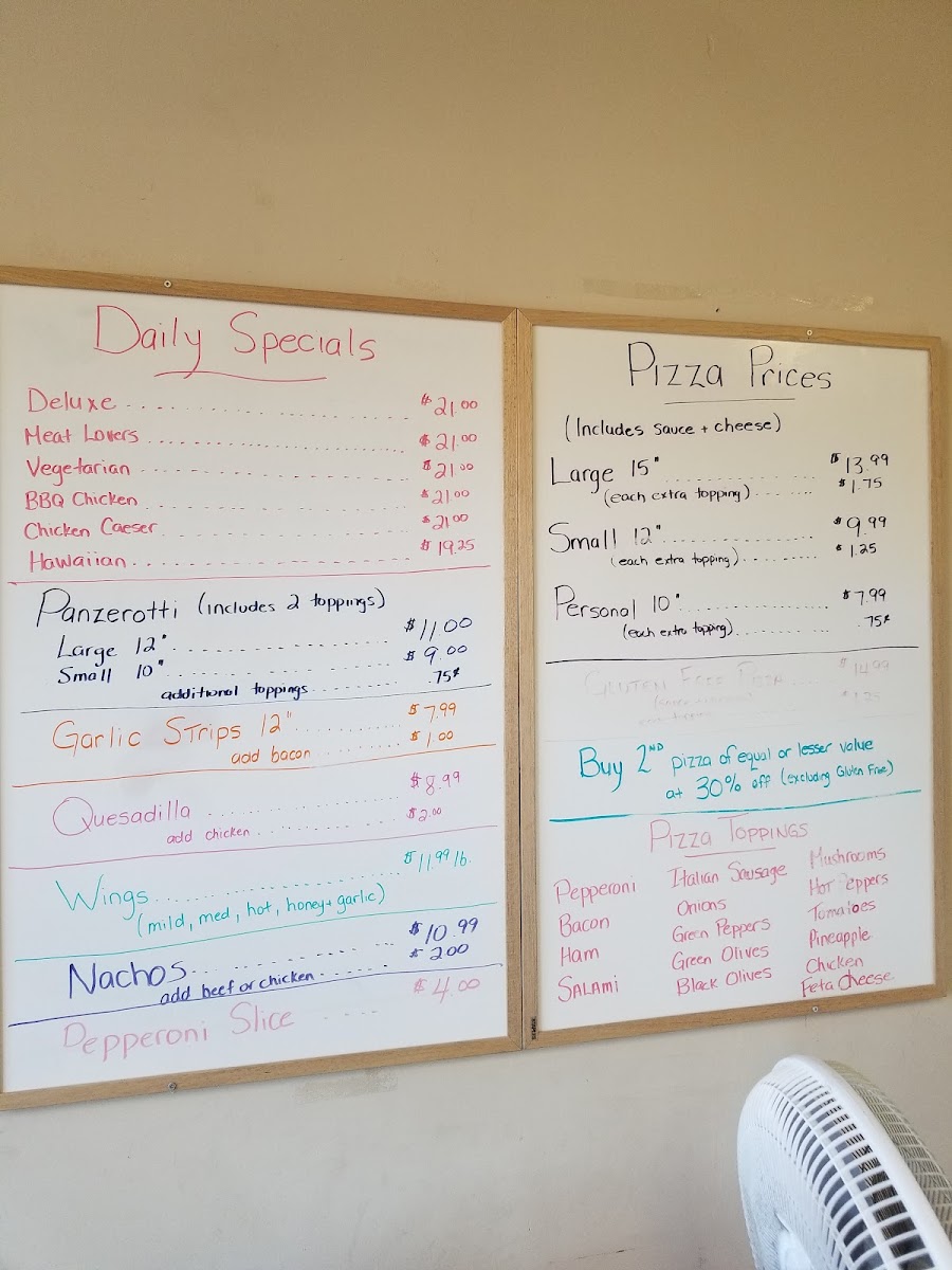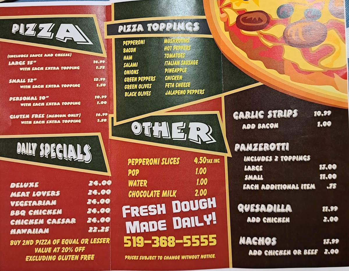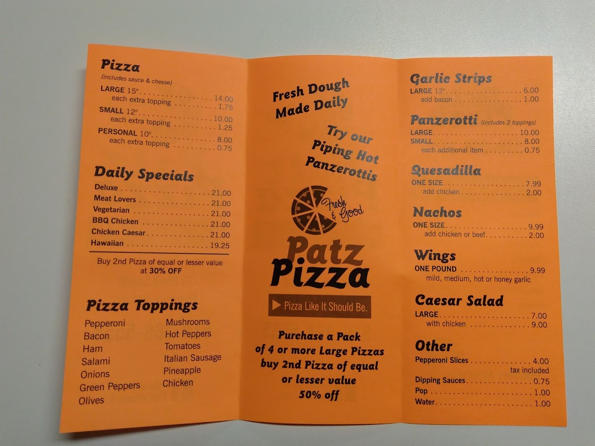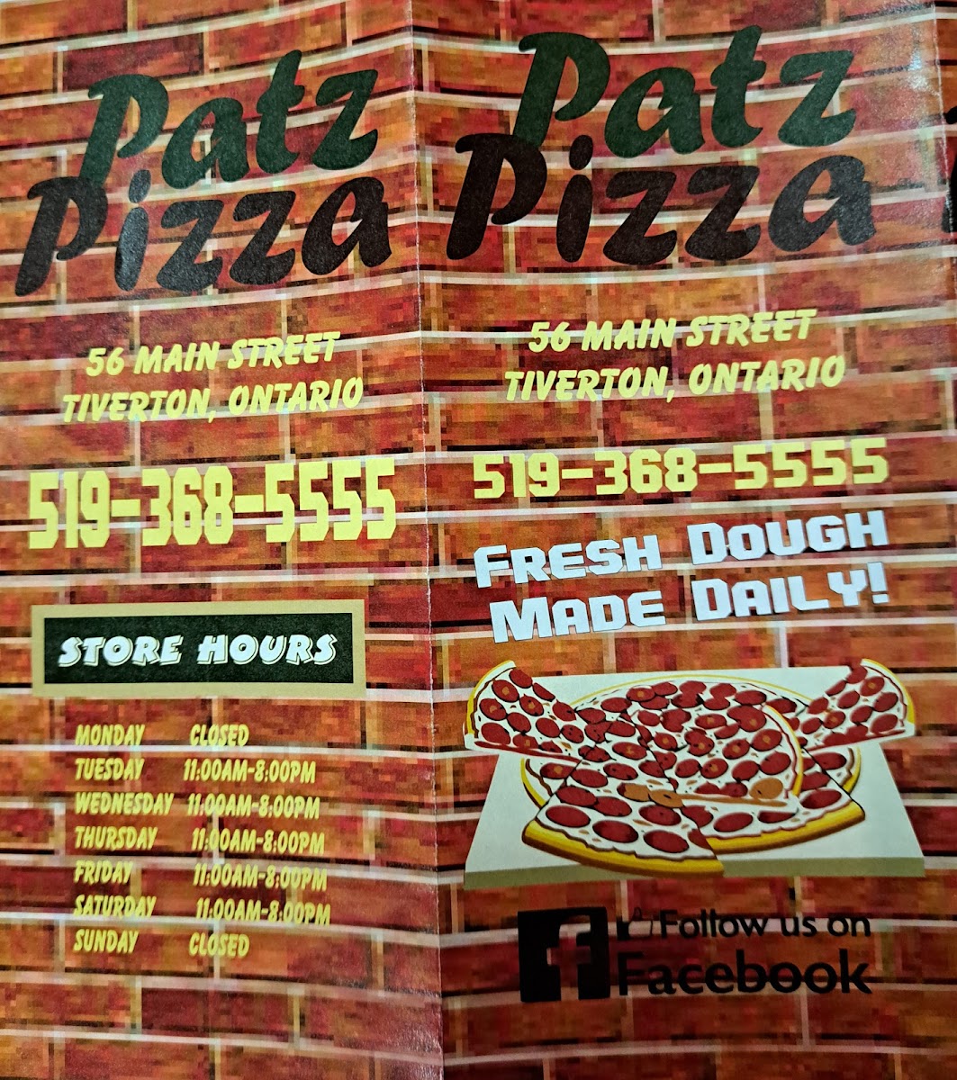 The menu at Patz Pizza offers a straightforward and comforting selection focused on classic, hearty pizzas and simple accompaniments. Designed for casual dining, it’s the kind of place where you can drop in for a relaxed meal after a day outdoors or a quick bite with family and friends.