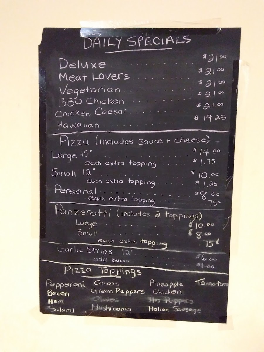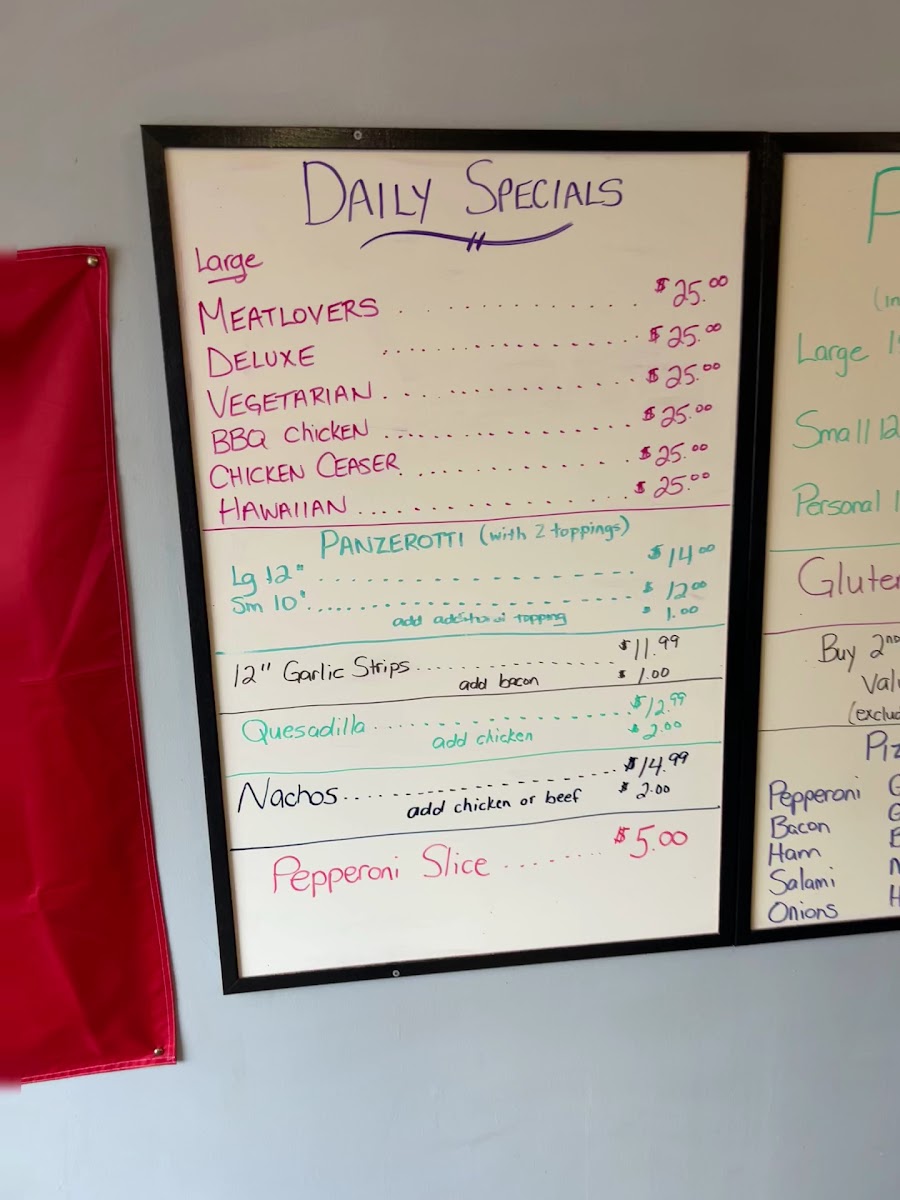 You'll find favorites like Hawaiian and Meat Lovers pizzas among daily specials that also include BBQ Chicken and Vegetarian options. Pizzas come in sizes that are perfect for sharing, along with convenient slices and familiar drinks such as pop, water, and chocolate milk to complement your meal.
